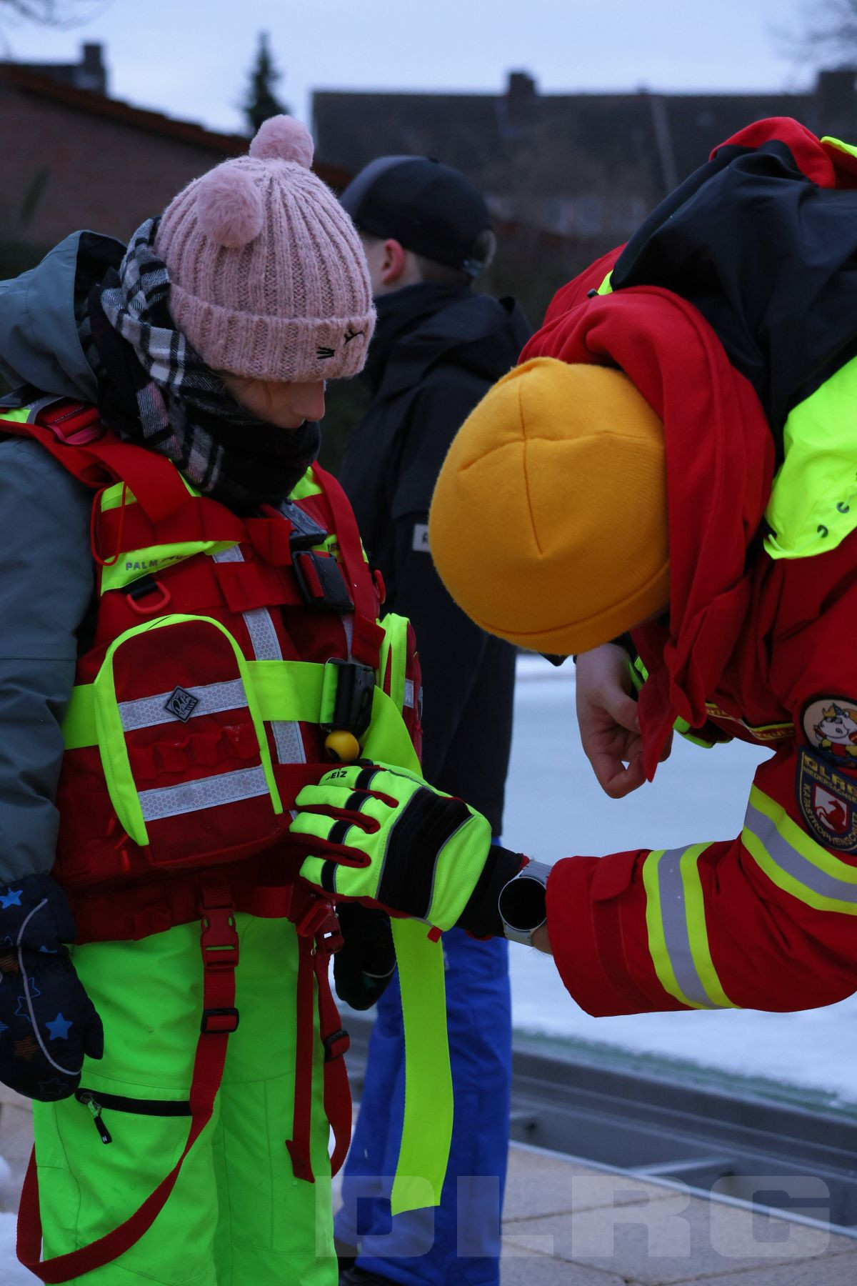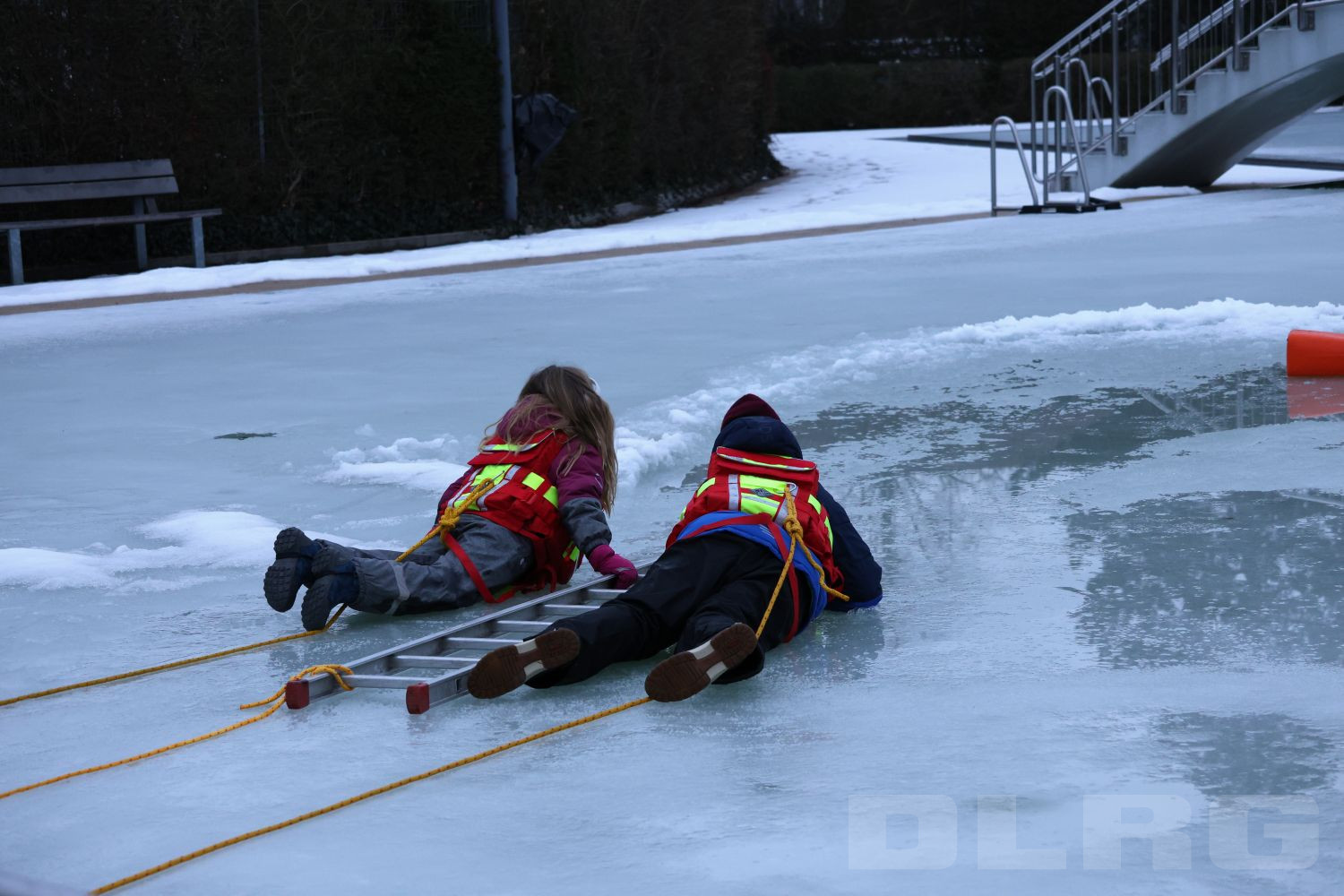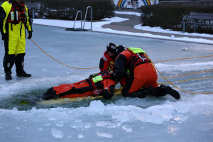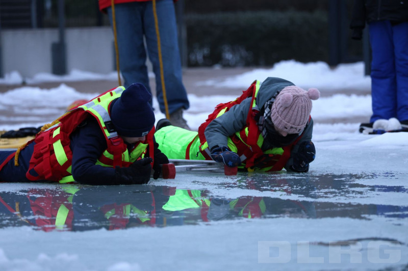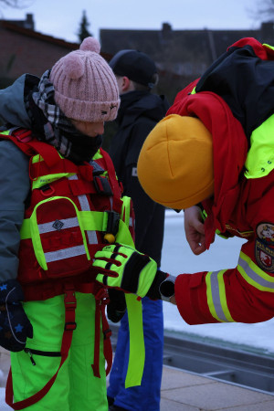Während die jüngeren Teilnehmenden auf dem flachen Bereich des Beckens mit einer Puppe geübt haben eine eingebrochene Person zu erreichen und sicher an Land zu bringen, konnten sich die älteren Jugendlichen und Erwachsenen mit speziellen Überlebensanzügen selbst in das eiskalte Wasser wagen. Dort lernten sie, wie man sich aus eigener Kraft befreien kann. Unter den wachsamen Augen der Ausbilder probten sie auch die richtige Fortbewegung auf dem Eis, das Nutzen von Rettungsmitteln und das Sichern und Retten von verunfallten Personen.